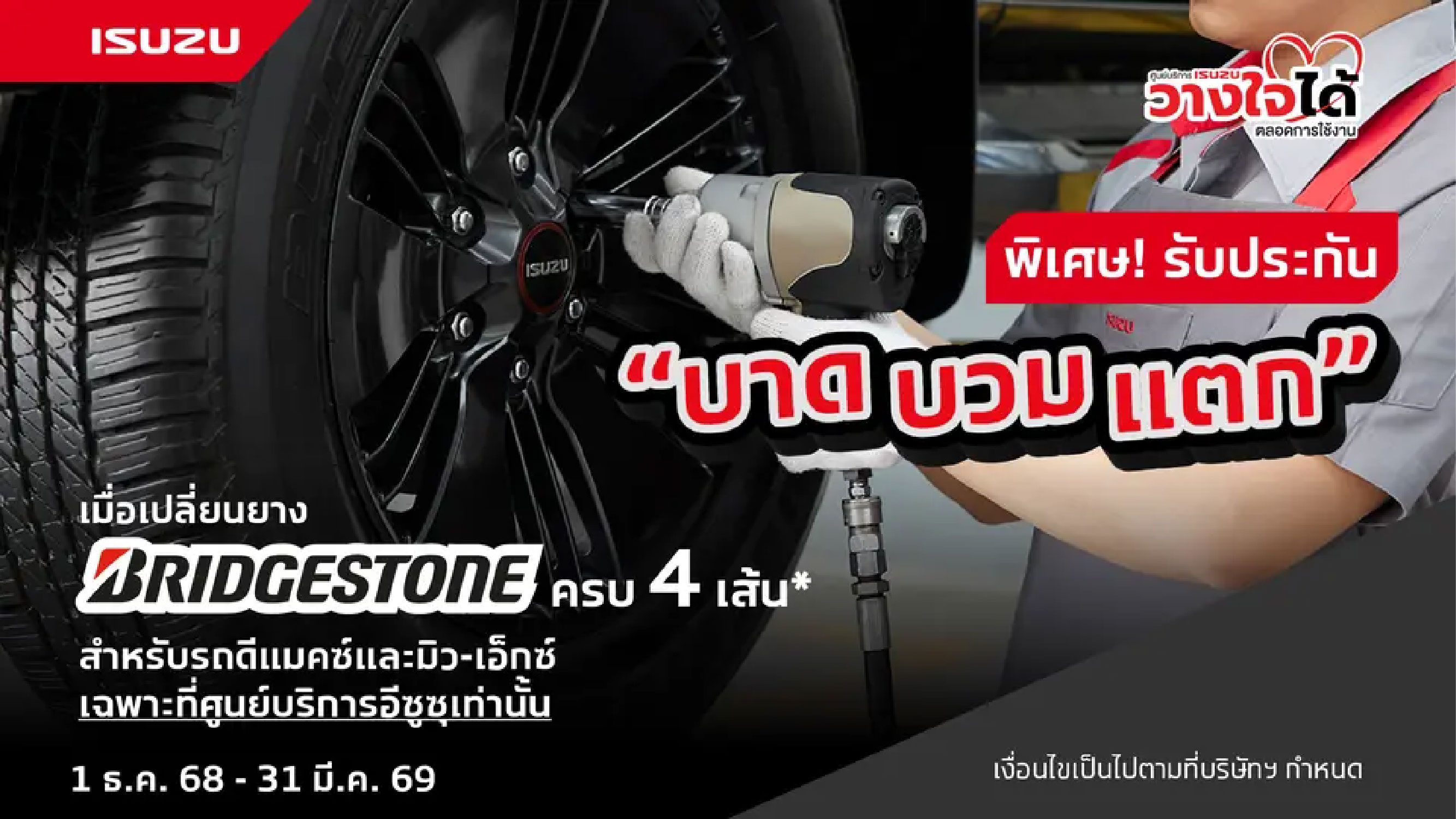 - เมื่อลูกค้าใช้บริการเปลี่ยนยางที่ศูนย์บริการอีซูซุ ระหว่างวันที่ 1 ธันวาคม 2568 - 31 มีนาคม 2569