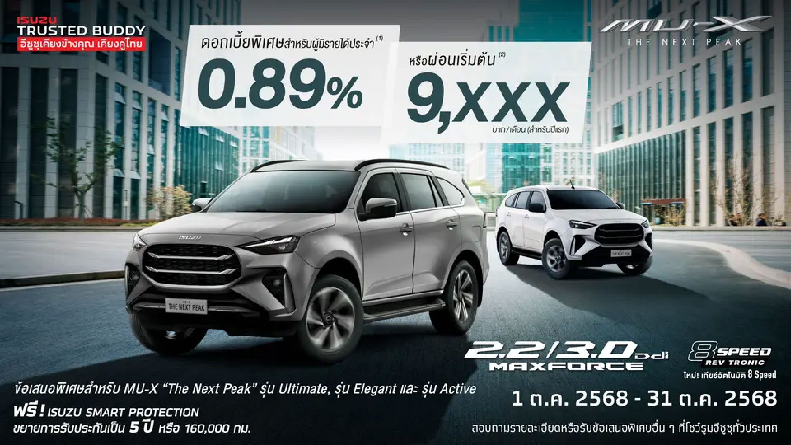 MU-X "THE NEXT PEAK" รุ่น Ultimate, รุ่น Elegant และ รุ่น Active ดอกเบี้ยพิเศษ 0.99% หรือ ผ่อนเริ่มต้น 9,xxx บาท (สำหรับปีแรก) หรือ ดอกเบี้ยพิเศษ 0.89% สำหรับผู้มีรายได้ประจำ