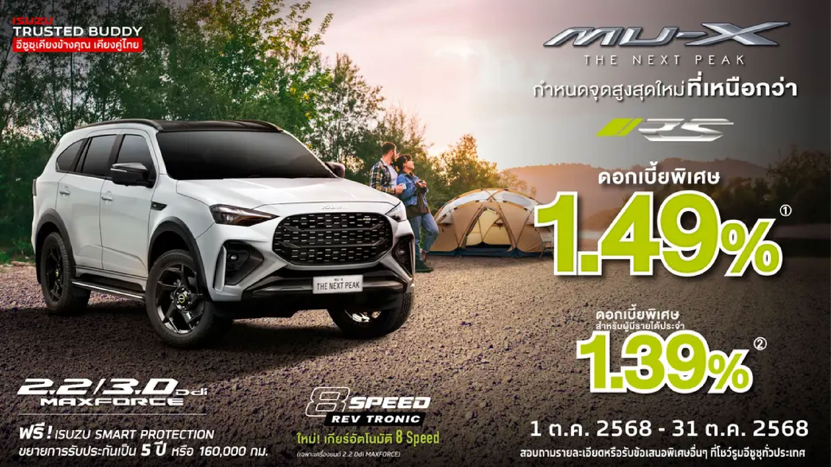 (1) อัตราดอกเบี้ยพิเศษ 1.49% ดาวน์ 25% ผ่อน 48 เดือน เมื่อซื้อรถอีซูซุมิว-เอ็กซ์ในรุ่น RS / เงื่อนไขเป็นไปตามสถาบันการเงินที่ร่วมรายการกับบริษัทฯ กำหนด /อ้างอิงอัตราดอกเบี้ยเดือน ต.ค. 2568