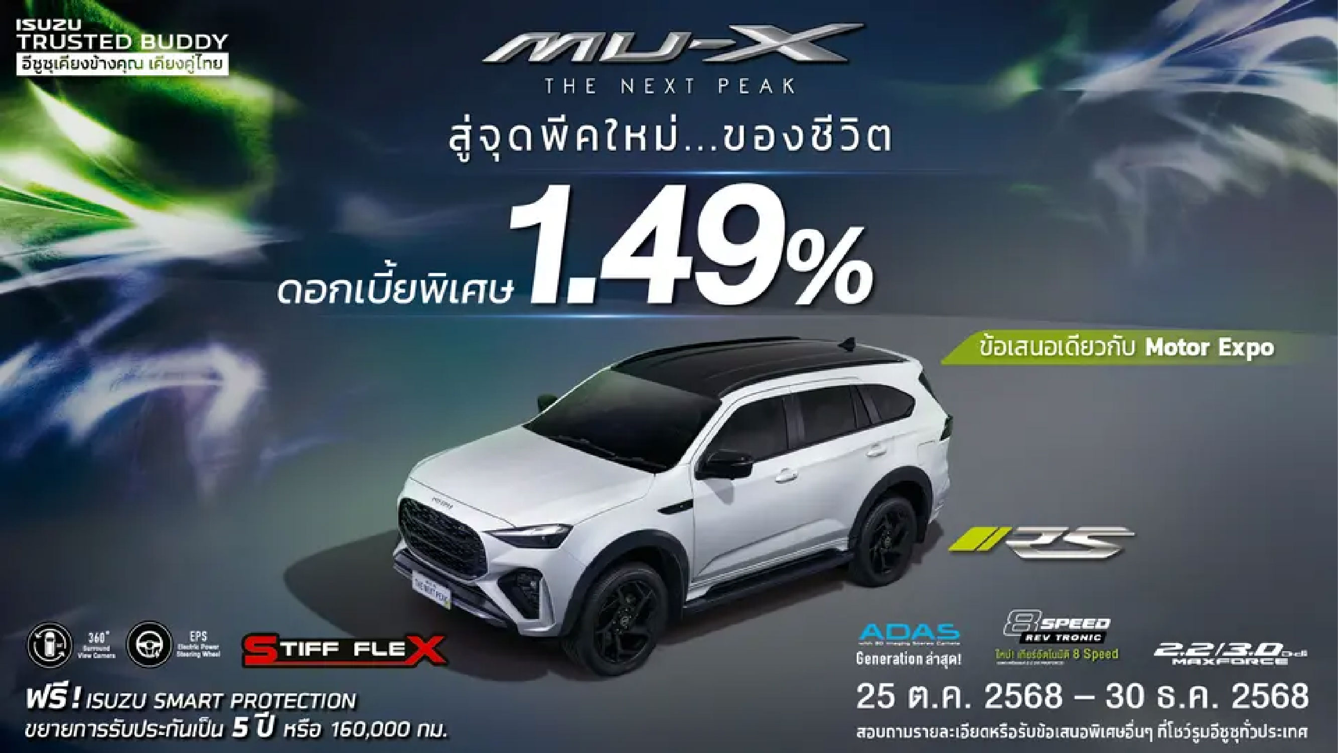 - อัตราดอกเบี้ยพิเศษ 1.49% ดาวน์ 25% ผ่อน 48 เดือน เมื่อซื้อรถอีซูซุมิว-เอ็กซ์ ในรุ่น RS / เงื่อนไขเป็นไปตามสถาบันการเงินที่ร่วมรายการกับบริษัทฯ กำหนด / อ้างอิงอัตราดอกเบี้ย ณ วันที่ 25 ตุลาคม 2568 – 30 ธันวาคม 2568
