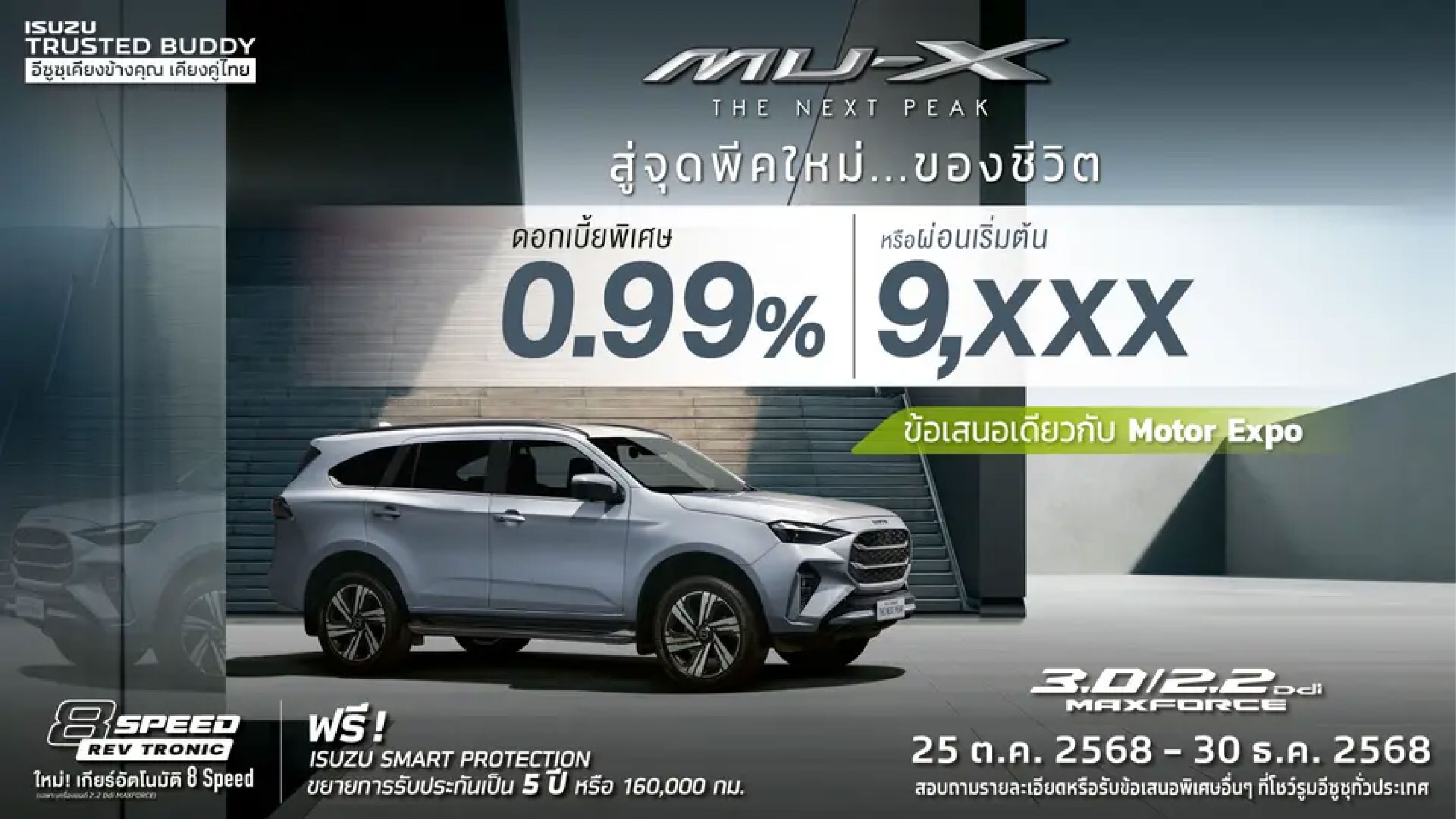 - อัตราดอกเบี้ยพิเศษ 0.99% ดาวน์ 30% ผ่อน 48 เดือน เมื่อซื้อรถ อีซูซุมิว-เอ็กซ์ ในรุ่น ACTIVE, ELEGANT , ULTIMATE / เงื่อนไขเป็นไปตามสถาบันการเงินที่ร่วมรายการกับบริษัทฯ กำหนด / อ้างอิงอัตราดอกเบี้ย ณ วันที่ 25 ตุลาคม 2568 – 30 ธันวาคม 2568
