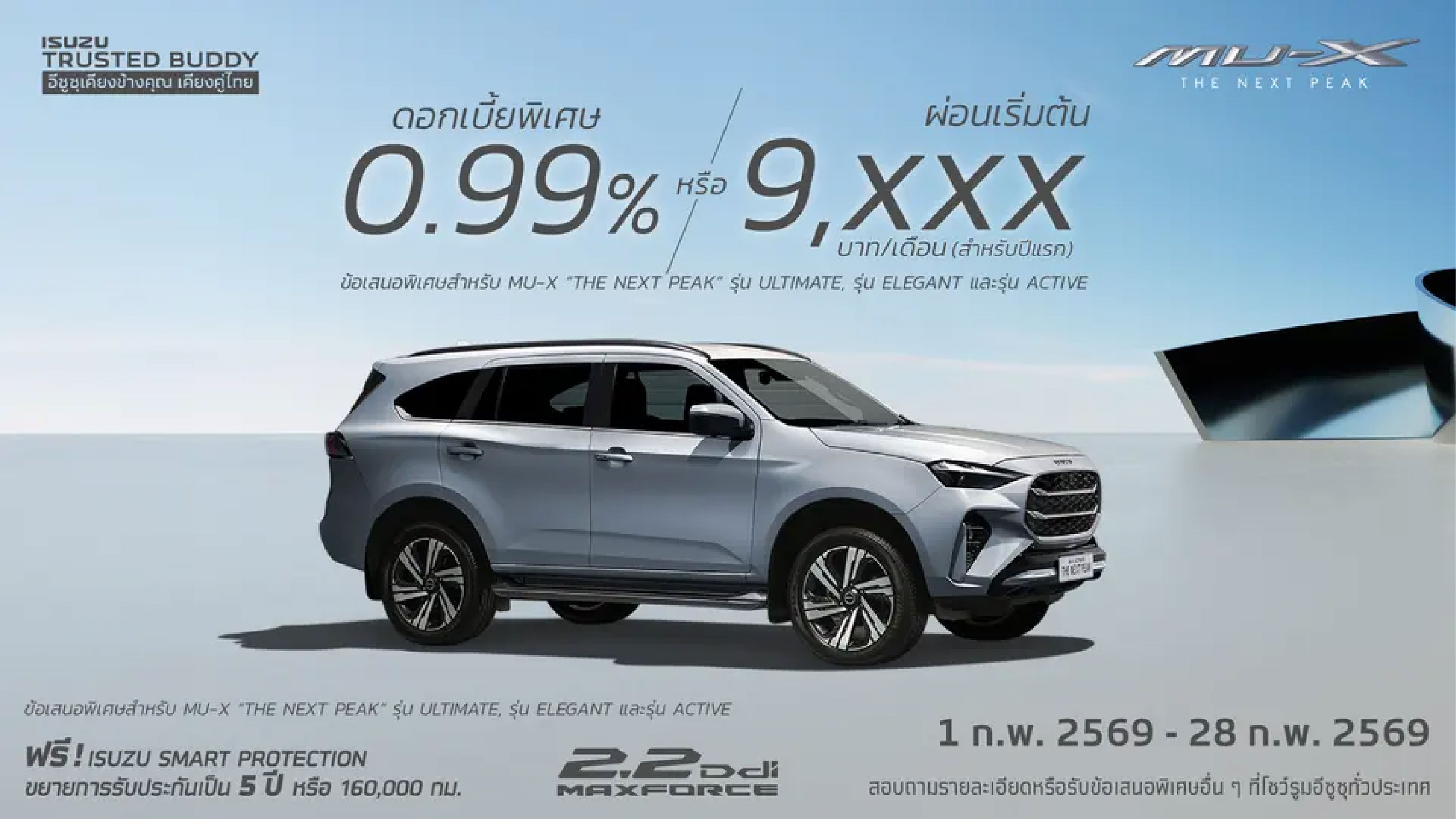 - อัตราดอกเบี้ยพิเศษ 0.99% ดาวน์ 30% ผ่อน 48 เดือน เมื่อซื้อรถ อีซูซุมิว-เอ็กซ์ ในรุ่น ACTIVE, ELEGANT, ULTIMATE / เงื่อนไขเป็นไปตามสถาบันการเงินที่ร่วมรายการกับบริษัทฯ กำหนด / อ้างอิงอัตราดอกเบี้ย ณ วันที่ 1 ก.พ. 2569 - 28 ก.พ. 2569